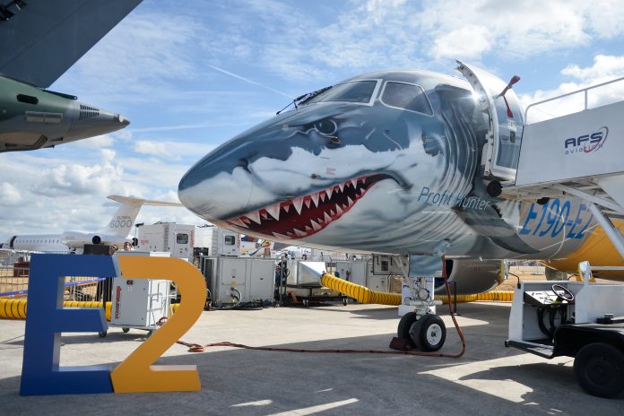 An Embraer SA E190-E2 passenger aircraft stands on display on day two of the Farnborough International Airshow (FIA) 2018 in Farnborough, U.K., on Tuesday, July 17, 2018.