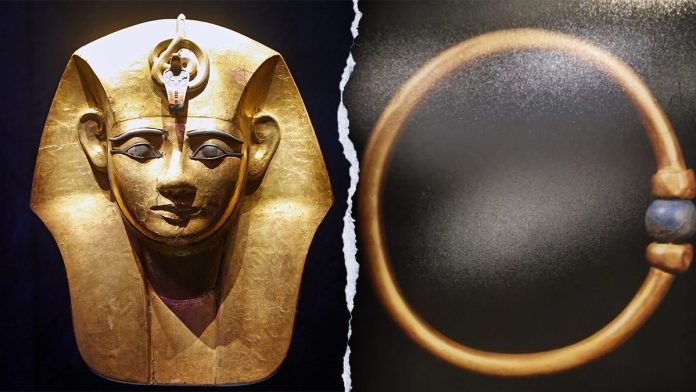 Egyptian authorities announced the theft of a gold and lapis lazuli bracelet once owned by Pharaoh Amenemope. (Chesnot/Getty Images; Egyptian Ministry of Tourism and Antiquities)
