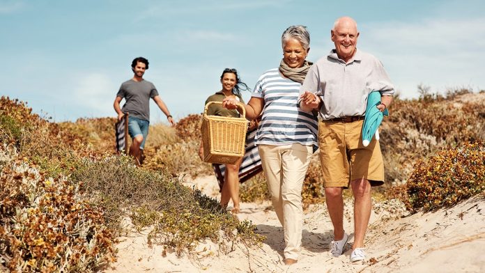 Husband trailing behind wife and in-law on family beach vacation, indicating tension over in-laws joining them on every trip