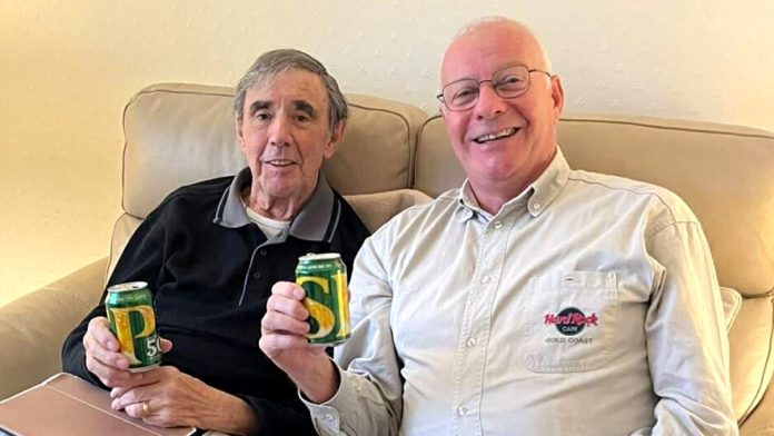 Bob Walker and Peter Gould sitting on the couch together and drinking a beer.