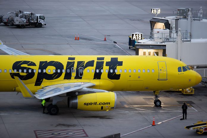 A Spirit Airlines plane is at George Bush Intercontinental Airport in Houston, Dec. 29, 2025.