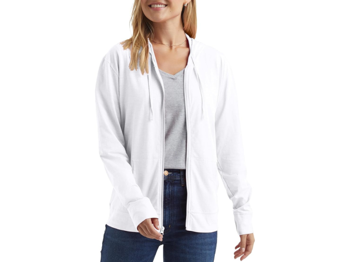 The Hanes hoodie is the perfect swap for your favorite cardigan. You can throw it on over a t-shirt or tank top without sacrificing style. It’s made with breathable cotton in a slub knit that gives it a little texture. The fabric is also lightweight without being gauzy, so it’s not bulky — that means you can wear it under a jacket on a chilly evening or on an airplane without adding too much extra weight.